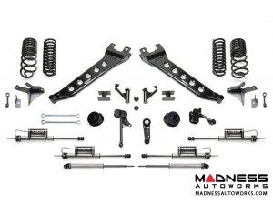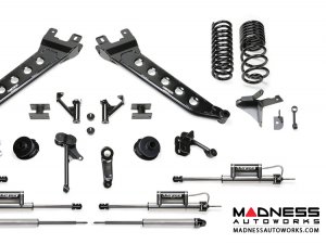 This Fabtech system utilizes front coil springs using a straight spring with patent pending angled lower mounts that create a very smooth ride compared to stock. Being that the factory springs are a high rate and bowed style, suspension characteristics naturally rides stiff along with an overactive response to road conditions. The engineers over at Fabtech’s utilized a straight spring design with a lower spring rate which in turn provides a smoother ride while retaining the factory carrying capacity.